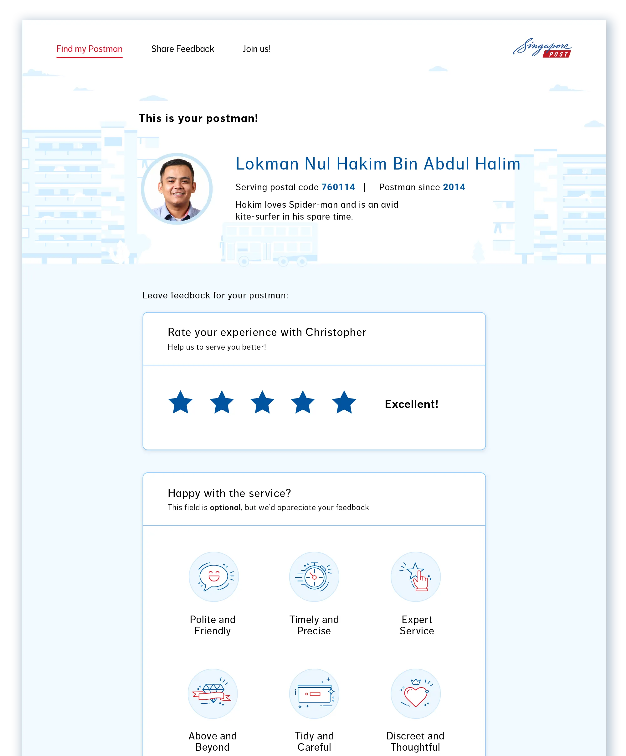 As part of the campaign and website which we developed for Singapore Post, almost 2 million sets of fridge magnets with QR-codes were distributed to every residential household and business unit across Singapore. Residents can access the website and key in their postal code to find out who is the postman serving their area. In addition, residents can also provide feedback, words of encouragement or rate the service they have received.